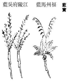 《图经》曰:蓝实,生河内平泽,今处处有之。人家蔬圃中作畦种莳,三月、四月生苗,高三二尺许,叶似水蓼,花红白色,实亦若蓼子而大,黑色,五月、六月采实。按蓝有数种:有木蓝,出岭南,不入药;有草45蓝,可以为淀者,亦名马蓝,《尔雅》所谓葴,马蓝是也;有蓼蓝,但可染碧,而不堪作淀,即医方所用也。