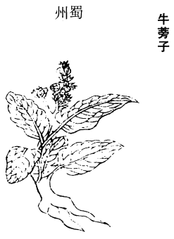 禹锡等按:《药性论》云:牛蒡可单用,味甘,无毒。能主面目烦闷,四肢不健,通十二经脉,洗五脏恶气。可常作菜食之,令人身轻。子研末,投酒中浸三日,每日服三二盏,任性饮多少,除诸风,去丹石毒,主明目,利腰脚。又食前吞三枚,熟挼下,散诸结节,筋骨烦热毒。又根细切如豆,面拌作饭3食之,消胀壅。又茎、叶煮汁酿酒良。又取汁夏月多浴,去皮间习习如虫行风,洗了慎风少时。又能搨一切肿毒。用根、叶入少许盐花捣。