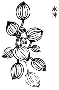 《唐本》注云:水萍者,有三种,大者名蘋。水中又有荇菜,亦相似,而叶圆。水上小浮萍,主火疮。