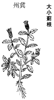 《图经》曰:小蓟根,《本经》不著所出州土,今处处有之。俗名青刺蓟。苗高尺余,叶多刺,心中出花头,如红蓝花而青紫色,北人呼为千针草。当二月苗初生二三寸时,并根作茹,食之甚美。四月采苗,九月采根,并阴乾入药,亦生捣根绞汁饮。以止吐血,衄血,下血,皆验。大蓟根,苗与此相似,但肥大耳。而功力有殊,破血之外,亦疗痈肿。小蓟专主血疾。