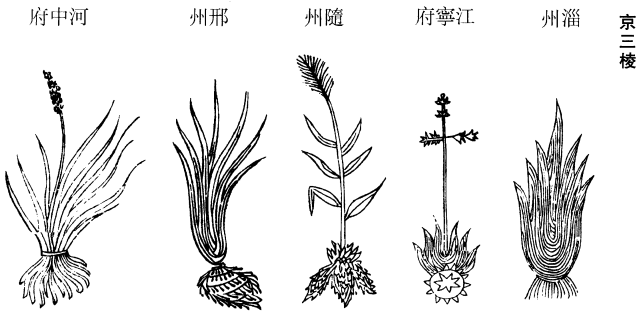 《图经》曰:京三棱,旧不著所出地土,今河、陕、江、淮、荆襄间皆有之。春生苗,高三四尺,似茭蒲叶皆三棱。五六月开花,似莎草,黄紫色。霜降后采根,削去皮、须,黄色,微苦,以如小鲫鱼状体重者佳。多生浅水傍,及陂泽中。其根初生成块,如附子大,或有扁者。傍生一根,又成块,亦出苗,其不出苗,只生细根者,谓之鸡爪三棱。又不生细根者,谓之黑三棱,大小不常,其色黑,去皮即白。河中府又有石三棱,根黄白色,形似钗股,叶绿色,如蒲,苗高及尺,叶上亦有三棱,四月开花,白色,如红蓼花,五月采根。亦消积气。下品别有草三棱条,云生蜀地,即鸡爪三棱也。其实一类,故附见於此。一说,三棱生荆楚,字当作荆,以著其地。《本经》作京,非也。今世都不复有。三棱所用皆淮南红蒲根也,泰州尤多,举世皆用之,虽太医不以为谬。盖流习既久,用根者不识其苗,采药者莫究其用,因缘差失,不复更辨。今三棱,荆襄、江淮水泽之间皆有。叶如莎草,极长,茎三棱如削,大如人指,高五六尺,茎端开花,大体皆如莎草而大,生水际及浅水中。苗下即魁,其傍有根横贯,一根则连数魁,魁上发苗。采时断其茎及横根,形扁长如鲫鱼者,三棱也。根末将尽,一魁未发苗,小圆如乌梅者,黑三棱也。又根之端钩屈如爪者,即鸡爪三棱。皆皮黑肌白而至轻。三者本一物,但力有刚柔,各适其用。因其形为名,如乌头、乌喙,云母、云华之类,非两物也。今人乃妄以凫茨、香附子为之。又《本草》谓京三棱,形如鲫鱼,黑三棱如乌梅而轻。今红蒲根至坚,重刻削而成,莫如形体。又叶扁茎圆,不复有三棱处,不知何缘名三棱也。今三棱皆独傍引二根,无直下根。其形大体多亦如鲫鱼。