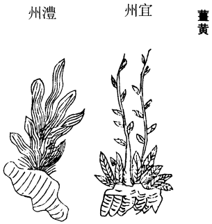 《图经》曰:姜黄、旧不载所出州郡,今江、广、蜀川多有之。叶青绿,长一二尺许,阔三四寸,有斜文如红蕉叶而小。花红白色42,至中秋渐凋。春末方生,其花先生,次方生叶,不结实。根盘屈,黄色,类生姜而圆,有节。或云真者是经种三年已上老姜,能生花,花在根际。一如蘘荷,根节坚硬,气味辛辣,种姜处有之。八月采根,片切暴乾。蜀人以治气胀,及产后败血攻心,甚验。蛮人生啖,云可以祛邪辟恶。谨按:郁金、姜黄、蒁药三物相近,苏恭不细辨,所说乃如一物。陈藏器解纷云:蒁,味苦,色青;姜黄味辛,温,色黄;郁金味苦,寒,色赤,主马热病。三物不同,所用全别。又刘渊林注《吴都赋》姜汇非一。云姜汇大如螺,气猛近於臭,南土人捣之以为齑茭。一名廉姜。生沙石中,姜类也。其味大辛而香,削皮以黑梅并盐汁渍之,乃成也。始安有之。据此,廉姜亦是其类,而自是一物耳。都下近年多种姜,往往有姜黄生卖,乃是老姜。市人买生啖之,云治气为最。医家治气药大方中,亦时用之。