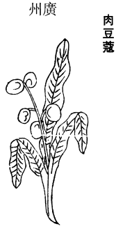 《图经》曰:肉豆蔻,出胡国,今惟岭南人家种之。春生苗,花实似豆蔻而圆小,皮紫紧薄,中肉辛辣,六月、七月采。《续传信方》治脾泄气痢等,以豆蔻二颗,米醋调面裹之,置於灰中令黄焦,和面碾末。更以炒了欓子末一两,相和。又焦炒陈廪米为末,每用二钱匕煎作饮,调前二物三10匕,旦暮各一服,便瘥。