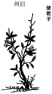 《图经》曰:使君子,生交、广州等,今岭南州郡皆有之,生山野中及水岸。其叶青,如两指,头长二寸。其茎作藤,如手指,三月生花,淡红色,久乃深红,有五瓣。七月、八月结子如拇指,长一寸许,大类栀子而有五棱,其壳青黑色,内有人,白色,七月采实。