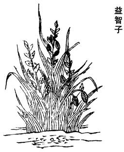 《图经》曰:益智子,生昆仑国,今岭南州郡往往有之。叶似蘘荷,长丈余。其根傍生小枝,高七八寸,无叶,花萼作穗生其上,如枣许大。皮白,中人黑,人细者佳。含之摄涎唾。采无时。卢循为广州刺史,遗刘裕益智粽,裕答以续命汤,是此也。