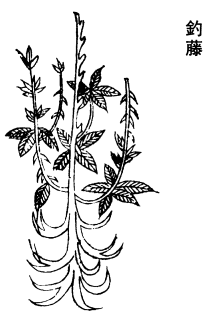 《图经》曰:钓藤,《本草》不载所出州土,苏恭云:出梁州,今亦兴元府有之。叶细茎长,节间有刺若钓钩。三月采。字或作吊。葛洪治小儿方多用之。其赤汤治卒得痫,用吊藤、甘草炙各二分,水五合,煮取二合。服如小枣大,日五夜三。大良。又《广济》及《崔氏方》疗小儿惊痫诸汤饮,皆用吊藤皮。