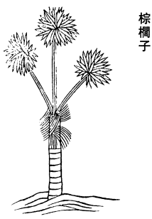 《衍义》曰:棕榈木,今人旋为器。皮烧为黑灰,治妇人血露及吐血,仍佐之他药。每岁剐取棕皮,不尔束死。花如鱼子,渫熟,淹为果。