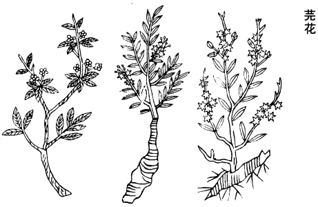 味辛、苦,温、微温,有小毒。主咳逆上气,喉鸣喘,咽肿,短气,蛊毒,鬼疟,疝瘕,痈肿,杀虫鱼,消胸中痰水,喜(音戏)唾,水肿,五水在五脏皮肤,及腰痛下寒毒肉毒。久服令人虚。一名去水,一名毒鱼,一名杜芫。其根名蜀桑根,疗疥疮。可用毒鱼。生淮源川谷。三月三日采花,阴乾。决明为之使,反甘草。