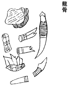 《图经》曰:龙骨并齿、角,出晋地川谷及泰山岩水岸土穴中死龙处,今河东州郡多有之。或云是龙蜕,实非死骨,得脊脑,作白地锦文,舐之著舌者良。齿小强,犹有齿形。角强而实。采无时。李肇《国史补》云:春水时至,鱼登龙门,蜕其骨甚多,人采以为药,而有五色者。《本经》云:出晋地。龙门又是晋地,岂今所谓龙骨者,乃此鱼之骨乎?或云骨有雄雌,细文而广者是雌,粗文而狭者是雄。凡入药,五色具者尤佳,黄白色者次,黑色者下。皆不得经落不净处,则不堪用。骨、齿医家常用,角亦稀使。石1晋时镇州接邢台界,尝2斗杀一龙,乡豪有曹宽者见之,取其双角,角前有一物如蓝色,文如乱锦,人莫之识。曹宽未经年为寇所杀,镇帅俄亦被诛。又云:海上人言龙每生二卵,一为吉吊。吉吊多与鹿游,或於水边遗沥,值流槎则粘著木枝,如蒲槌状,其色微青黄,复似灰色,号紫稍花,坐汤多用之延龄。
