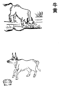 《图经》曰:牛黄,出晋地平泽,今出登、莱州,他处或有,不甚佳。凡牛有黄者,毛皮光泽,眼如血色,时复鸣吼。又好照水,人以盆水承之,伺其吐出,乃喝迫,即堕落水中,既得之,阴乾百日。一子如鸡子黄大,其重叠可揭,轻虚而氛香者佳。然此物多伪,今人试之,皆揩摩手甲上,以透甲黄者为真。又云:此有四种:喝迫而得者名生黄;其杀死而在角中得者,名角中黄;心中剥得者,名心黄,初在心中如浆汁,取得便投水中,沾水乃硬,如碎蒺藜或皂荚子是也;肝胆中得之者,名肝黄,大抵皆不及喝迫得者最胜。凡牛之入药者,水牛、𤚩牛、黄牛取乳及造酥、酪、醍醐等,然性亦不同,水牛乳凉,𤚩牛乳温,其肉皆寒也。其自死者皆不可食。其酥以合诸膏,摩风肿,腕跌血瘀,则牛酥为强,醍醐尤佳。又有底野迦,是西戎人用诸胆和合作之,状似久坏丸药,赤黑色,今南海或有之。又中品有牛角鳃,用水牛、黄牛久在粪土中烂白者,主赤白下,烧灰末服之。