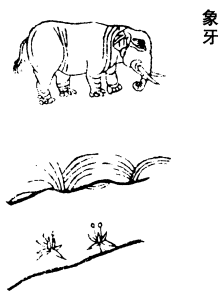 《海药》:馑按《内典》云:象出西国,有二牙、四牙者,味寒。主风痫热,骨蒸劳,诸疮等,并皆宜生屑入药,琥珀、竹膏、真珠、犀角、牛黄等良。西域重之,用饰床座。中国贵之,以为笏。昆仑诸国有象,生於山谷,每遇解牙,人不可取,昆仑以白木为牙易之。《酉阳杂俎》云:生文理必国富。又云:龙与象,六十岁骨方足。