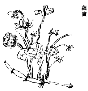 《图经》曰:藕实茎,生汝南池泽,今处处有之。生水中,其叶名荷。谨按:《尔雅》及陆机疏谓:荷为芙蕖,江东呼荷。其茎茄;其叶蕸(加遐二音或作葭);其本蔤,茎下白蒻在泥中者;其华未发为菡萏,已发为芙蓉;其实莲,上谓房也;其根藕。凡此数物,今人皆以中药。藕,生食其茎,主霍乱后虚渴烦闷,不能食及解酒食毒。花,镇心,益颜色,入香尤佳。荷叶,止渴,杀蕈毒。今妇人药多用荷叶者。叶中蒂,谓之荷鼻。主安胎,去恶血,留好血。实,主益气。其的至秋表皮黑而沉水者,谓之石莲。陆机云:可磨为饭,如粟饭,轻身益气,令人强健。医人炒末以止痢,治腰痛。又治哕逆,以实人六枚,炒赤黄色,研末,冷热水半盏,和服,便止。惟苦薏不可食,能令人霍乱。大抵功用主血多效。(蒻音若。)