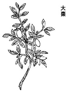 味甘,平,无毒。主心腹邪气,安中养脾,助十二经,平胃气,通九窍,补少气,少津液,身中不足,大惊,四肢重,和百药,补中益气,强力,除烦闷,疗心下悬,肠澼。久服轻身长年,不饥神仙。一名乾枣,一名美枣,一名良枣。八月采,暴乾。三岁陈核中人燔之,味苦。主腹痛,邪气。生枣,味甘、辛。多食令人多寒热,羸瘦者不可食。叶,覆麻黄,能令出汗。生河东平泽。杀乌头毒。(燔音烦。)