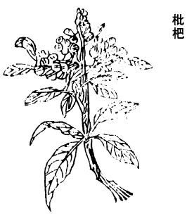 《衍义》曰:枇杷叶,江东、西,湖南、北,二川皆有之。以其形如琵琶,故名之。治肺热嗽有功。花白,最先春也。子大如弹丸,四五月熟,色若黄杏,微有毛,肉薄,性亦平,与叶不同。有妇人患肺热,久嗽,身如炙,肌瘦将成肺劳。以枇杷叶、木通、款冬花、紫菀、杏仁、桑白皮各等分,大黄减半,各如常制。治讫,同为末,蜜丸如樱桃大,食后、夜卧,各含化一丸,未终一剂而愈也。