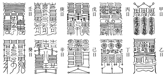 右符二十二道,按日辰,背面书之。假如甲子日见怪,面书甲符,背书子符。凡书符,并斗诀、罡炁、朱书。令见怪人佩带,可格休祥。书符讫,诵灭怪大咒七遍敕之。