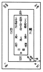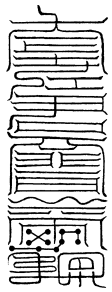 此符治一切血食邪庙、先贤古人祠宇假名占祭之神,及楼台、园圃、癈宅、空堂之中,强邪恶鬼结萃党伍,或久占名胜,夺人居止,或急取生魂,或通淫妇女,入梦歌宴,或降附妖言,希求造庙,或求妖祭,作过不一。当以梓木朱书此符,钉之。次以一道付被祟之家,钉中堂,则妖自息矣。(此六符主治不同,行用则一。凡书符时,存己为天蓬。发用时,亦然。凡除给符付人户及钉镇外,凡每日三时,煞鬼坛上逐一烧之,诵天蓬咒。若欲斩鬼,将符就鬼门上剪作二片,其怪自死。有大报应,或空中号泣,或坛上有血,皆其验也。)