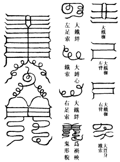 师曰:九泉者,北都罗酆幽泉,恶狱也。事系天庭,不可轻行。故酆都为天下鬼神之府,专检制魔妖之权行,今宣威莫大於此。凡狱有九,一曰酆泉号令之狱。二曰重泉斩馘之狱。三曰黄泉追鬼之狱。四曰寒泉毒害之狱。五曰阴泉寒夜之狱。六曰幽泉煞伐之狱。七曰下泉长夜之狱。八曰苦泉屠戮之狱。九曰溟泉考焚之狱。凡九狱,各有所主,第一狱主摄天魔。第二狱主摄不职典祠。第三狱主摄山魈精魅。第四狱主摄江湖水怪。第五狱主摄血食邪神。第六狱主摄山林木客。第七狱主摄古墓伏尸。第八狱主摄师巫、逆鬼。第九狱主摄刑亡横死。凡狱前列斗灯,径阔一尺二寸,牵罡二尺四寸。前列九狱,每狱前悬追鬼符,内悬重刑符。狱门悬一竹竿,长三尺,挂追鬼榜,总门挂塞鬼路符。逐日三时上香行持,向晓看迹,即知是何鬼也。轻则禁锁,重则三涂重役,太重者灭迹除形。如法: