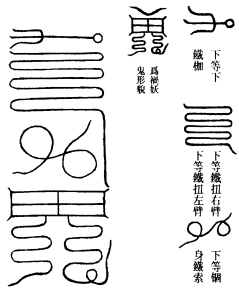 此符治一切水怪,应江、海、湖、湫、潭元、溪源、井洞之中,多有蛟蜃、蛇蟒,兼有孽龙,其状不一,皆能兴风作浪,损人舟船,坏人性命。又或托形现相,交通妇女、生人者,并以此符焚之,其怪自殒绝矣。用铁札投水中,黄纸书符,焚之。