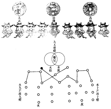 依赤明召将之旨,焚符召将,如变水火之法。官将围绕水池火沼,上帝临轩,慈尊证变,九天罗布,南辰北斗帝君森列。召水火二君摄化亡魂,为婴儿焚符,摄婴入水。水如秋月光辉,白炁混溶,婴儿身明莹。摄入火炼,火如春日和炁,蒸炼婴成。金团中,彷彿有像,交炼於紫金光中。日月合璧,引魂入干中,九炁灌溉,金光明彻。良久,惟见金团无数矣,不知所知。炼度毕矣。