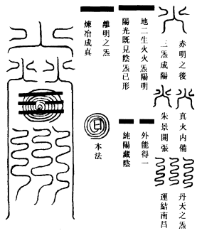 运日精阳光符,合真火炎赫火池,冶炼魂神於日精光中。但婴儿乘日金火光,出炎入交炼。