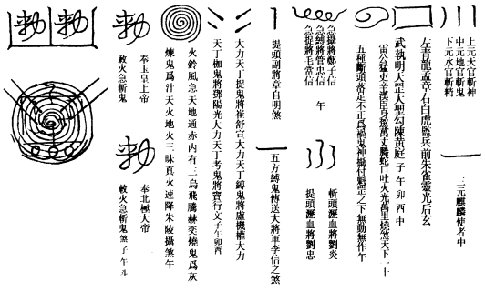 右符,存北极大帝在头上,四圣列旁,四空黑云,戈甲纷纭。兆面奉北帝付此符,吞入口,火光四迸,雷声喧轰,便开目书符,用全幅黄纸,研朱面北书之。此符上帝极刑,可以镇贴宅庭,则四维鬼神出界九里。若焚于怪地,天将行威扫荡,地界方三十里寂静。书符时志诚,当入室默奏坐定,然后书之。大煞文,北炁。