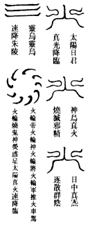 师曰:旸乌真火九芒符者,日光符也。旸谷,日出抟桑之地也。乌乃日中三足乌也,乌,鸦也。其鸦三足,法木三炁,木能生火故也。日有九芒,阳数也。此符极热极暖,治一切沈寒痼冷、泄㵼转筋、寒颤自汗、面黑唇青、手足厥逆、吃噫吐痰、腹痛自利,皆宜服之。每服五符,撚作小丸子,面南或东,枣汤吞下。