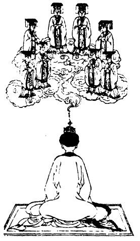 次思白炁从兆泥丸中入,兆乃口吸神云,咽津六过,结作六神,状如金星,淡碧衣冠,下入绛宫,入两膀胱,穿尾闾穴,夹脊,上入泥丸,分两耳上,下入十二间梁之外,神面相向立,顺时吐息。