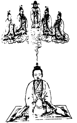 次思黄炁从兆泥丸中入,兆乃口吸神云,咽津八过,结作八神,黄衮冕,穿尾闾,上充背穷骨下节之户,复出其神,罗列两边,顺时吐息。