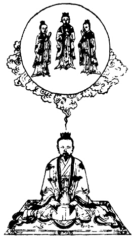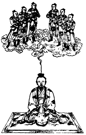 次思绛云从兆泥丸中入,兆乃口吸神云,咽津三过,结作一神,状如帝王,朱衣冠,下布胸间四极之口,化为一轮百宝神光,神在光内,顺时吐息。