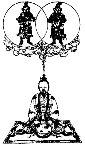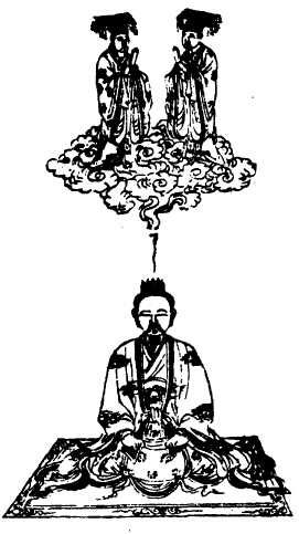 次思碧炁从兆泥丸中入,兆乃口吸神云,咽津二过,结作二神,状如二帝,青衣冠,下布太仓之腑,五肠之口,神面相向立,顺时吐息。