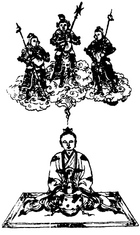 次思五色云炁从兆泥丸中入,兆乃口吸神云,咽津三过,结作三神,状如神将,身披金甲,各执兵杖,下布绛宫,入左膀胱,穿尾闾穴,入脊髓,上过第一椎耳后,过入左耳之下伏晨之户,神去身五丈,顺时吐息。
