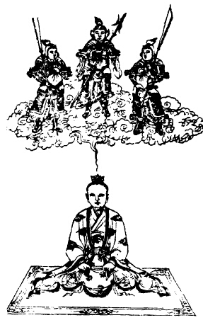 次思玄云之炁从兆泥丸中入,兆乃口吸神云,咽津三过,结作三神,状如神将,身披金甲,各执兵杖,下布绛宫,入右膀胱,穿尾闾穴,上入脊髓,上过第一椎耳后,过入右耳之下,伏晨之户,神去身五丈,顺时吐息。