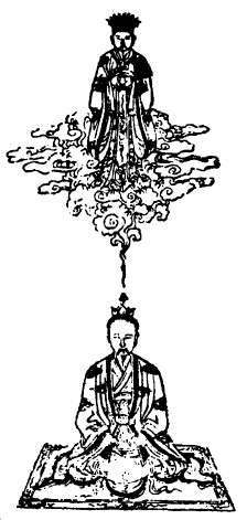 次思玉光从兆泥丸中入,兆乃口吸神云,咽津二过,结作二神,黑衮冕,下布九肠之口,伏梁之下户,顺时吐息。