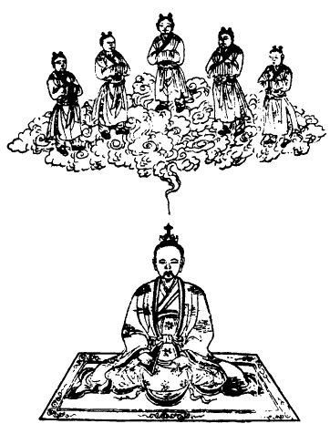 次思晖光从兆泥丸中入,兆乃口吸神云,咽津五过,结作五神,状如孩童,下布五藏,上充华盖,入鼻凹,五色神云分入两目,左三右二,摇睛九过,顺时吐息。