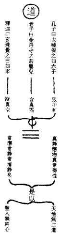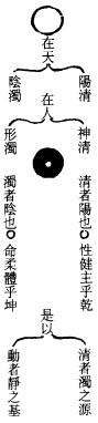 夫道之为物,虚而无象,因气化而有道之名。道生于一,一生于二,二气感合而生万物,理自然也。道居天地之先,包含覆载,寂静无名,乃曰无极之真也。无极之中道因虚极而已,阳发而遂通,无极而太极,是二五之精妙合而凝也。太极动而生阳,静而生阴。阳清而为天,主於动;阴炁浊而为地,主於静。天覆於地,地载於天,天动地静,二气互交。阳气先者为阳道,阴炁先者为阴道。《易系》所谓乾道成男,坤道成女。男体天故清、故动,女体地故浊、故静。男女相感,阴阳翕畅,泄其真精,降本流末,而生万物。万物之生,同此之理,炁质化行,各从其类,生生化化,则道无不一焉。孔云:君子之道,造端乎夫妇,及其至也,察乎天地。是以顺则生人、生物,逆则成佛、成仙。周子作《太极图》,深得其旨矣。是故斯经尊妙,只此数语,已了一本《周易》。以丹道言之,天地喻炉鼎,男女喻坎离,以乾刚运阳火不息,乃曰天清、男动;以坤柔退阴符而混藏,乃曰地浊、女静。因阴阳有动静之机,故用抽坎填离,返本还源而复道,是降其本而流其末,生养吾身之万物也。有何疑哉?
