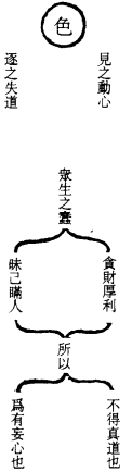 六欲者,眼、耳、鼻、舌、身、意也。三毒者,贪嗔痴也。人身之中有三尸之神,其名曰彭琚、彭踬、彭蹻,是为三魂。人有念头不正者,魂神即令人驰聘错乱,贪著邪淫,入於鬼道,丧本迷真。《度人经》所云,鬼道易邪是也。世人若能解悟四大一身,是地、水、火、风假合而有此幻形,到头终有败坏,睹其万物之有形者,无不同此之理,我则从今不贵其物,唯究一心。心为一身之宝。心是地,性是君,君来心地上居住,主宰万机,常存渊默之真。此灵不随世变,一切物欲尽能遣之,自然心自静而神自清,六欲不生而三毒自消灭矣。《道德经》云,圣人为腹不为目,故去彼取此,是也。