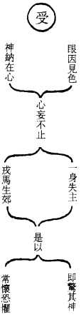 此承上云,因眼见於色,神即领受在心;心既领受,遂起妄念,本身元神化为识神;神随境乱,意逐情迷。《道德》云:所谓驰骋田猎,令人心发狂;难得之货,令人行妨。是以即惊其神也。皆因心君不能为主,被色相眩惑,耗散其真道,则梦寐亦不安宁也。