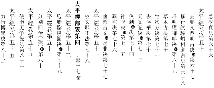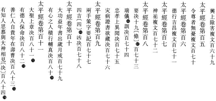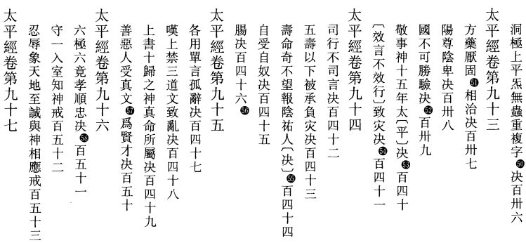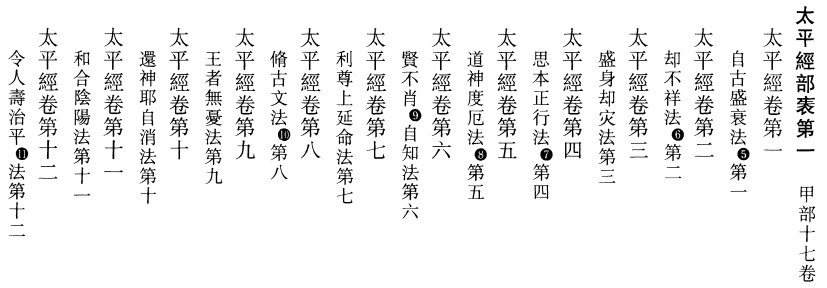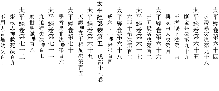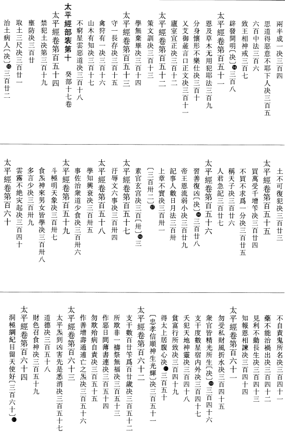 《太平经》甲第一云:诵读吾书精之,灾害不得复起。此上古圣贤所以候得失之文也。书有三等,一曰神道书,二曰核事文,三曰浮华记。神道书者,不离实,守本根,与阴阳合,与神同门,核事文者,考核异同,疑误不失。浮华记者,离本已远,错乱不可常用,时时可记,故名浮华记。然则精学之士,务存神道,习用其书,守得其根1。根之本宗,三一为主,一化以三,左无上,右玄老、中太上。太上统和,无上摄阳,玄老捻阴。阴合地,阳合天,和均人。人天及地,号为三刀,各有五德,五德伦分,修事毕,三才复一。得一者生,失-者死。能遵上古之道,则到太平之辰。故曰三老相应,三五燕和,和生生照,梁行无死名也。和则温清调适,适则日月光明,人功既建,天地顺之。故曰先安中五,乃选仙士,贤者心贤,必到圣治。甲第二云:天四五九之道,不可失也。天地失之,万事乱常;五行失之,更相贼伤;四时失之,梁不行人至不行人失之2,身被疾病。守之则吉,失之则伤。三皇常善者,能深用之,审得其意可诫。是其人开,非其人闭,审得其人,可以致寿,可以致乐,可以除耶疾。德薄得之迟,德厚得之速。君子至信乃传道,慎勿付小人。得人则授,不言信誓正当重,不能数遇。遇此经者,皆为真人,所师玄师,无极之神,应感而现,事已即藏。流布叔方,澄清大乱,功高德正,故号太平。圣主善治,谨用兹文,凡君在位,轻忽斯典。羲农之始,莫不奉遵,周汉之终,必也屏弃。《百八十戒序》云:赧王之时,出太平之道,老子至琅那,授与干君。干君得道,拜为真人,作《太平经》。圣人应感出文,述而不作。凡夫弃故,不复识知,缘见维亲,顺情言作耳。帛君笃病,从干君受道,拜为神人。干君讳室,涉乱迁移,易名为吉,寓居东方,往来吴会,周历齐幽,出入伊洛,教训后生,救厄治疾。顺帝之时,弟子宫崇诣阙上书,言师干吉所得神经于曲阳泉上,朱界青首,百有余卷。〔有司〕谓为妖讹,遂不信用。帝君不修太平,其自下潜习,以待后会,贤才君子,密以相传。而世伪人耶,多生因假,矫诡肆愚,疵妨正典。《相尔》云:世多耶巧,托称道云,千端万伎,朱紫盘磷。故记三合以别真,上下二篇法阴阳。复出青领太平文,杂说众要,解童蒙心。复岀五斗米,道备三合,道成契毕,数备三道。虽万恶犹纷,猗公行和,窃号之正目,事乖真实,师之所除。《玄妙内篇》云:吾布杰罢废上清、清约、佛三道,下及干吉太平支散之界百官之神,天地水月三官不正之泉,贪浊受钱饮食之鬼,营传符庙,一切骆驿分罢。夫假称上清受及佛干支离3,偏见执着,自是华炫之耶,皆应摆弃,况号俗神者乎?拾俗4及诸诈文,求真宜寻本旨,案上清、清约、无为佛道。众圣大师,各有本经。干氏本部,自甲之癸,分为十亠表,百七十卷。玄文宕博,妙旨深长,品次源流,条谄如左。