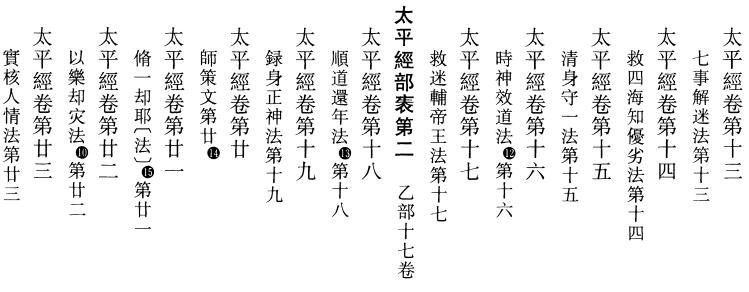 经名:太平经目录。原题“太平部卷第二”。内载《太平经目録》及前序后记。撰人不详,约出于南北朝。《正统道藏》未收。现存敦煌S.4226号残抄本一件。参校本:王明《太平经合校》(简称合校0