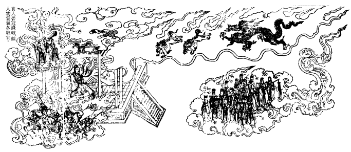 真人碧冠绿帔黄服,车辇人物云彩并取宜