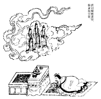 存竟,礼十方,次礼真经真人曰:礼经时,心注太上老君,三拜,次念尹先生,河上真人,玄中法师,复三拜。常三万六千仙童玉女侍经烧香,为兆求白日升天之道者也。