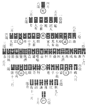 《周易参同契》曰:朔旦为复䷗,阳气始通。出入无疾,立表微刚。黄钟建子,兆乃滋彰。播施柔暖,藜蒸得常。䷒临炉施条,开路正光。光耀浸进,日以益长。丑之大吕,结正低昂。仰以成䷊泰,刚柔并隆。阴阳交接,小往大来。辐凑於寅,运而趍时。渐历䷡大壮,侠列卯门。榆荚堕落,还归本根。刑德相负,昼夜始分。䷪夬阴以退,阳升而前。洗濯羽翮,振索宿尘。䷀乾健盛明,广被四邻。阳终於巳,终而相干。䷫姤始纪绪,履霜最先。井底寒泉,午为蕤宾。宾服於阴,阴为主人。䷠遁去世位,收敛其精。怀德竢时,栖迟昧冥。䷋否闭不通,萌者不生。阴伸阳诎,没阳姓名。䷓观其耀景,察仲秋情。任蓄微稚,老枯复荣。荠麦牙蘗,同冒以生。䷖剥烂支体,消灭其形。化气既竭,亡失至神。道穷则反,归乎䷁坤元。恒顺地理,承天布宣。玄幽远眇,隔阂相连。应度育种,阴阳之原。寥廓恍惚,莫知其端。先迷失轨,后为主君。无平不陂,道之自然。变易更盛,消息相因。终坤始复,如循连环。帝王承御,千秋常存。邵子《大易吟》曰:天地定位,否、泰反类;山泽通气,损、咸见义;雷风相薄,恒、益起意;水火相射,既济、未济。四象相交,成十六事;八卦相重,为六十四。朱子谓此释方图两交股底卦,东南角乾,便对西北角坤,旧作东南角坤,便封西北角乾。天地定位也。西南角否,对东北角泰,否、泰反类也。不知怎生恁地巧。新安程氏直方曰:邵子云先天学,心法也,图皆从中起,万化万事生於心也。曰皆者,兼方圆图而言也。天地定位,圆图从中起也。雷动风散,方图从中起也。圆者动,以定位为本;方者静,以动散为用。动而无动,静而无静,固先天之心法与。