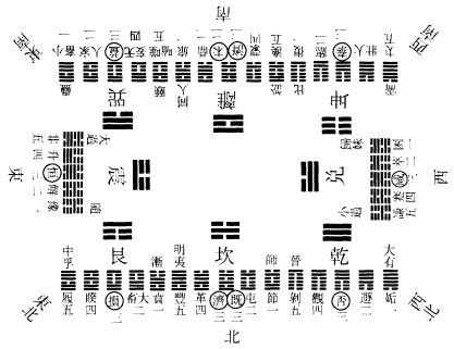 按此图以先天图一仰一覆,下体八卦静而守位,上体八卦动而右转,由是刚柔相摩,八卦相荡,一贞而八悔。八八六十四卦,左右相交。震宫八卦,震交於坤,起於复,次震,次噬嗑,次随、无妄、益、屯,至颐,而得贞悔反对之象。震下艮上,二象反对。离宫八卦,离交於艮,起於贲,次明夷,次丰,次离、革、同人、家人,至既济,而得阴阳交中之卦。离下坎上,三阳三阴,昼夜平分。兑宫八卦,兑交於坎,起於节,次损,次临,次归妹、睽、兑、履,至中孚,而得贞悔反对之象。兑下巽上,二象反对。乾宫八卦,乾交於巽,起於小畜,次需,次大畜,次泰、大壮、大有、夬,至乾,而得六阳纯体之卦极焉。此图之左方也。巽宫八卦,巽交於乾,起於姤,次巽,次井,次蛊、升、恒、鼎,至大过,而得贞悔反对之象。巽下兑上,二象反对。坎宫八卦,坎交於兑,起於困,次讼,次涣,次坎、蒙、师、解,至未济,而得刚柔中分之卦。坎下离上,三刚三柔,昼夜平均。艮宫八卦,艮交於离,起於旅、次咸,次遯,次渐、蹇、艮、谦,至小过,而得贞悔反对之象。艮下震上,二象反对。坤宫八卦,坤交於震,起於豫,次晋,次萃,次否、观、比、剥,至坤,而得六阴纯体之卦周焉。此图之右方也。环而观之,则乾、坤、泰、否、坎、离、既、未、随、蛊、渐、归妹、颐、大过、中孚、小过,凡一十六卦,交易反对,三位相间,累累若贯珠,若纲在网,有条而不紊。察其自然之妙,非人力之所能为也。是故以一岁之节论之,震始交坤,一阳生冬至之卦。变坤为复,是以乾起於复之初九,而尽於午中。巽始消乾,一阴生夏至之卦。变乾为姤,是以坤起於姤之初六,尽於子中。乾、坤定上下之位,冬至变坤,阴多,多寒,昼极短,而夜极长;夏至变乾,阳多,多热,昼极长,而夜极短。冬夏二至,阴阳合也。乾坤交中而为坎离,坎离交而为既未,既未交南北两间之中,春分变既济而为节,是以坎起於节之九二,而尽於酉中。秋分变未济而为旅,是以离起於旅之六二,而尽於卯中。三阳、三阴,温凉适宜,昼夜平等,春秋二分,阴阳离也。立春变颐而为贲,颐卦二阳外而四阴内;立夏变中孚而为小畜,中孚四阳外而二阴内,此春夏阳在外而阴在内,圣人春夏养阳之时。立秋变大过而为困,大过二阴外而四阳内;立冬变小过而为豫,小过四阴外而二阳内,此秋冬阳在内而阴在外,圣人秋冬养阴之时。是则一岁周天之节备于图,而邵子所谓春夏秋冬,昼夜长短,由乎此者也。又以一月之度推之,则重坤之时,乃晦朔之间,以次而生明。小过之震反对二震,三日昏时出庚之西也;大过之兑反对二兑,八日上弦在丁之南也。至十五,则乾体就望而盛满,出於东方甲地,以渐而生魄。中孚之巽反对二巽,十八日平明见辛之西也;颐卦之艮反对二艮,二十三日下弦直丙之南也。此一月太阴之行度备于图,而邵子所谓晦朔弦望,行度盈缩,由乎此者也。至若艮东北之卦,万物之所成终所成始,故冬至之卦尽於艮山雷颐卦。而立春之节起於艮山火贲卦,自然之数也。故曰:易与天地准。