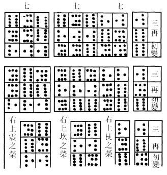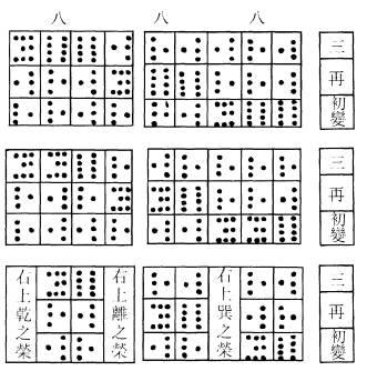 ,识其以阳变阴也。三变皆得偶,有类於坤,其画为×,识其以阴变阳也。三变得两奇一偶,以偶为主,即其偶之在初,在二,在三,有类於巽、离、兑,其画为⚋而不变。三变得两偶一奇,以奇为主,即其奇之在初,在二,在三,有类於震、坎、艮,其画为⚊而不变。凡有是八体,亦八卦之象也。为⚊者,二十四体。为⚋4者,亦二十四体。为