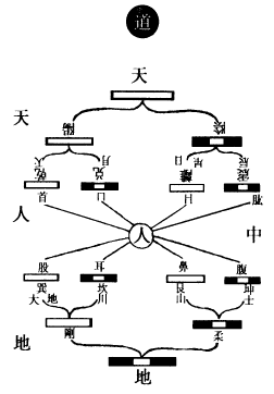《易》曰:乾坤成列,而《易》立乎其中。斯理也,成之在人,故人受天地、阴阳、五行之气以成形,大抵一身同乎天地。此图背阳腹阴,头圆象奇,窍阴象偶;身半以上同乎天,身半以下同乎地。督脉,阳脉也,起於下极之俞,并於脊里,上至风府,入属於脑。冲脉,阴脉也,起於气冲,并少阴之经,侠齐上行,至胸中而散。故右象自巽中爻至乾上爻,象尻至顶,督脉之行也;自震中爻至坤下爻,象胸至少腹,冲脉之道也。《内经》言背为阳,阳中之阳,心也;离为心火。背为阳,阳中之阴,肺也;兑为肺金。心、肺居上,其位高,离、兑之象也。腹为阴,阴中之阴,肾也;坎为肾水。腹为阴,阴中之阳,肝也;艮反震为肝木。肾肝居下,其位卑,坎、艮之象也。脾者,中州阴中之至阴,故其位居中。此皆阴阳表里内外相输应,故以应天之阴阳也。三焦有名无形,谒道诸气。《灵枢经》云:上焦如雾溉灌诸经,中焦如沤腐熟水谷,下焦如渎膀胱潴水。夫人能顺五气以摄生,和五味以养身,明五性以全德,循五常以行道,则能参赞而成位育之功。夫然谓之践形,故曰:人也者,天地之德,阴阳之交,鬼神之会,五行之秀气也。子程子曰:世之人,务穷天地万象之理,不知反之一身五脏六腑毛发筋骨之所存,鲜或知之。善学者取诸身而已。自一身以观天地,此其义也。