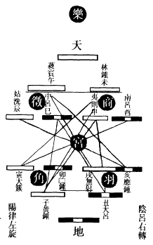 《豫》之《象》曰:雷出地奋,豫;先王以作乐崇德,殷荐之上帝,以配祖考。王者功成,治定三纲,正九畴叙,百姓和洽,乃作《乐》以宣八风之气,立春,艮为条风,亦云融风。春分,震为明庶风,亦云谷风。立夏,巽为清明风。夏至,离为景风,亦云凯风。立秋,坤为凉风。秋分,兑为闾阖风。立冬,乾为不周风。冬至,坎为广莫风。以类万物之情。天地之气,感而太和,气至之应,不爽时刻,故造律之法,先定中声,以立其本,以次递互,损益相生,终於十二,而得三统之义焉。天开於子,子为天统,积阳为天。阳数始於一,究於九。九者,阳之用,故黄钟之律管长九寸三分。《损》一下生林钟未。未者,丑之冲也。地辟於丑,丑为地统,积阴为地。阴数始於二,中於六。六者,阴之用,故林钟之律管长六寸三分。《益》一上生太簇寅。人生於寅,寅为人统。人者,阴阳之交,参於三,合於八,故太簇之律管长八寸。八者,伏羲氏之所以画八卦,顺天地,通神明者也。三统相通,三正迭用,阳律娶妻,阴律生子,六律六同,历辰十二,还相为宫,而其义为无穷矣。(《周官》大师掌六律、六同,以合阴阳之声。黄钟、大簇、姑洗、蕤宾、夷则、无射,阳声也。大吕、应钟、南吕、林钟、小吕、夹钟,阴声也。盖日月会於十二,次而右转,圣人制六同以象之。斗柄运於十二辰而左旋,圣人制六律以象之。六律,阳也,左旋以合阴。六同,阴也,右转以合阳。同位者,象夫妇。异位者,象子母。本乎乾爻者,为六律。本乎坤爻者,为六同。六律左旋而生同,同为同位,所以象夫妇。六同右转而生律,为异位,所以象子母。间八而生,所以象八卦。旋之5为官,所以象三才。)阳道常饶,自子至巳,阳之道也,其管皆长。阴道常乏,自午6至亥,阴之行也,其管皆短。由是节之以五声,长者声下,短者声高,下者重浊而舒迟,高者轻清而剽疾。宫为君,君者主也,居中以畅四方。唱始施生,为四声纲,故声中於宫,触於角,祉於徵,章於商,宇於羽。(和平沉厚,粗大而下者,宫声也。劲凝明违,从上而下归於中者,商声也。圆长通彻,中平而正者,角声也。抑扬流利,从下而上归於中正者,徵声也。䁏䁏而远彻,细小而高者,羽声也。《传》曰:闻宫音使人温舒而广大,闻商音使人方正而好义,闻角音使人恻隐而爱人,闻徵音使人乐善而好施,闻羽音使人整齐而好礼。)宫为君,商为臣,角为民,徵为事,羽为物。(宫无为以覆物,君之象也。商有为而通物,臣之象也。角善触而难驭,民之象也。徵出无而验有,事之象也。羽因时而翕张,物之象也。宫为君足以御臣,商为臣足以治民,角为民足以兴事,徵为事足以成物,羽为物足以致用。此其序也。)本之以五行金、木、水、火、土,揆之以五则规、矩、权、衡、绳,正之以五事貌、言、视、听、思,播之以八音金、石、丝、竹、匏、土、革、木,经之以八卦,而天施地化,人事之纪备矣。故夫黄钟之长,十分为寸,十寸为尺,十尺为丈,十丈为引;分、寸、尺、丈、引五度审而长短定。以之审量,则黄钟之管九寸,其中容秬黍千二百粒以为龠。十龠7为合,十合为升,十升为斗,十斗为斛;龠、合、升、斗、斛五量审而多少均。以之平衡,则黄钟所容千二百黍,其重十二铢,两龠则二十四铢,八卦二十四爻。为一两,十六两为一斤,三百八十四铢,六十四卦三百八十四爻。三十斤为一钧,万有一千五百二十铢。二篇之策,万有一千五百二十。四钧为石;铢、两、斤、钧、石五权谨而轻重平矣。故律者顺乎天地,本乎阴阳,应乎人伦,原乎情性;风之以德,感之以乐,故民莫不同一而天下化成矣。(《乐书》曰:人受天地之中以生,莫不钟五行之秀,性五常之德。其化之也,不过以五声之和达五常之性而已。故闻宫音,斯达诚实之心以为性;闻徵音,斯达恭敬之心而为礼;闻商音,斯达羞恶之心而为义;闻羽音,斯达是非之心而为智;闻角音,斯达恻隐之心而为仁。夫如是,则乐行而伦清,外则耳目聪明,内则血气和平,移风易俗,天下皆宁矣。)