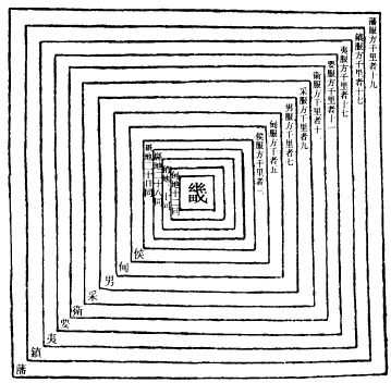《比》之《象》曰:地上有水,比;先王以建万国,亲诸侯。王者,疆理天下,封建邦国,以藩卫王室,亲诸侯,所以比天下也。夏、殷之制,盖不可考矣。今因《周礼》辨方正位,体国经野之文,而图次王畿千里,乡、遂、都、鄙、甸、稍、县、畺之制,而诸侯分封大小侯、甸、男、采、卫、要、夷、镇、藩九服,远近因以并见焉。《疏》:太平之世,土广万里,中国七千;中平之世,通夷狄七千,中国五千;衰末之世,通夷狄五千,中国三千。故《孟子》谓海内之地方千里者九,公侯地方百里,伯七十里,子男五十里,分土三等。盖夏、殷之制,而周初因之。至周公相成王,斥大九州,增封有功诸公之地方五百里,诸侯之地方四百里,诸伯之地方三百里,诸子之地方二百里,诸男之地方一百里3,不能百里而附於诸侯者为附庸。《王制》云:州建二百一十国,八州千六百八十国。则大较言之耳。