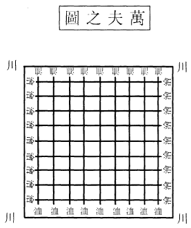 右万夫之地,地方三十三里少半里。此图一方当百夫,百夫有洫,一行当千夫。千夫有浍,九浍而川周其外。若以百夫之图观之,则一方为一夫,夫间有遂。以洫作遂观之。一行为十夫,十夫有沟。以浍为沟观之。亦九沟而达于洫。以川为洫观之。其沟、浍广深,郑注与井田相准。但井田法沟浍稀少,而此沟洫法沟浍稠多。此川广深,当亦倍浍,与自然之川异;彼则百里之间,一大川耳。