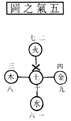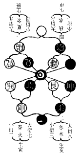 为柔刚,即图书中五之上下左右。其数则阳一阴四,刚三柔二,衍而一六、二七、三八、四九,即图、书四维之东、西、南、北;分为八卦,合为五行。五行之生也,各一其性。此图之象原其生,而河图之位据其旺,而5洛书之位总其变,大衍之周揭其实也。河图,木东、火南、金西、水北,正也。洛书,金火易位,金南火西,变也。夫以始生之序言之,坎、巽生於地之刚,朱子所谓少阳。少阳之位寅,於时为春,其数三,小衍成五则有二,大衍成十则有七,二、七为火,故火生在寅,旺於午。稽之河图,则二、七居南,而乾、兑得其位。乾居七,兑居二。乾、兑生於天之阳,朱子所谓太阳。太阳之位巳,巳为六阳之极。於时为夏,其数一,小衍成五则有四,大衍成十则有九,四、九为金,故金生在巳,旺於酉;稽之河图,则四、九居西,而巽、坎得其位。巽居四,坎居九。乾交坎,而坎交乾;巽易兑,而兑易巽也。离、震生於天之阴,朱子所谓少阴。少阴之位申,於时为秋,其数四,小衍成五则有一,大衍成十则有六,一、六为水,故水生在申,旺於子;稽之河图,则一、六居北,而坤、艮得其位。艮居一,坤居六。坤艮生於地之柔,朱子所谓太阴。太阴之位亥,亥为六阴之极。於时为冬,其数二,小衍成五则有三,大衍成十则有八,三、八为木,故木生在亥,旺於卯;稽之河图,则三、八居东,而离、震得其位。震居三,离居八。坤交离,而离交坤;震易艮,而艮易震也。是知先天之象本之图,乾七、兑二位乎刚,离八、震三位乎柔,天之四象交乎地也;坤六、艮一位乎阴,坎九、巽四位乎阳,地之四象交乎天也。后天之象本之图,乾、兑生於天之阳,乾一、兑九而成十;乾居一,兑居九。离、艮生於天之阴,震反为艮。离七、艮三而成十;离居七,艮居三。坤震生於地之柔,艮反为震。坤二震八而成十;坤居二,震居八。坎、巽生於地之刚,坎六巽四而成十。坎居六,巽居四。今图后天巽二而坤四者,邵子所谓长女代母者也。先、后二天象数脗合,则图画卦厥有旨哉。