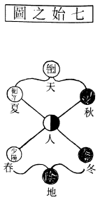 夫四时之气,由乾坤、阖辟、动静、阴阳、升降、消息使之然也。冬至阴极生阳,夏至阳极生阴,乾坤、阴阳之合也。秋分阴之中,坤之阖;春分阳之中,乾之辟。冬、夏二至,阴阳合也。春、秋二分,阴阳离也。按图而观,义斯可见。是故揆之卦画,验之天时,以冬至前后各三十日为一节;小雪至大寒。春分前六十日为一节,大寒至春分。后六十日为一节,春分至小满。夏至前后各三十日为一节,小满至大暑。秋分前六十日为一节,大暑至秋分。后六十日为一节,秋分至小雪。六六凡三百有六十日。外卦巽温、乾热、震凉、坤寒,天地四时之正气也。中央坎、离、艮、兑四卦,配为雨、旸、燠、寒、风;天地四时之游气也。游气纷扰,参差不齐,五者来备,各以其时,则百谷用成,庶草蕃庑,休征类应。极备极无,则百谷用不成,咎征变见。唯圣人在位,致中和以成其位育之功,则五事修而天人应,感之几微矣。
